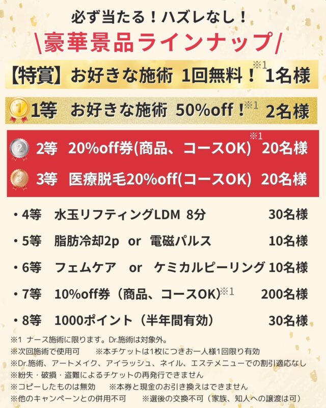 【特賞】お好きな施術 1回無料 🥇【1等】お好きな施術 50%OFF 🥈【2等】20%OFF券(商品・コースOK) 🥉【3等】医療脱毛20%OFF(コースOK) そのほか、美肌ケア・LDM・脂肪冷却・電磁パルスなど💕